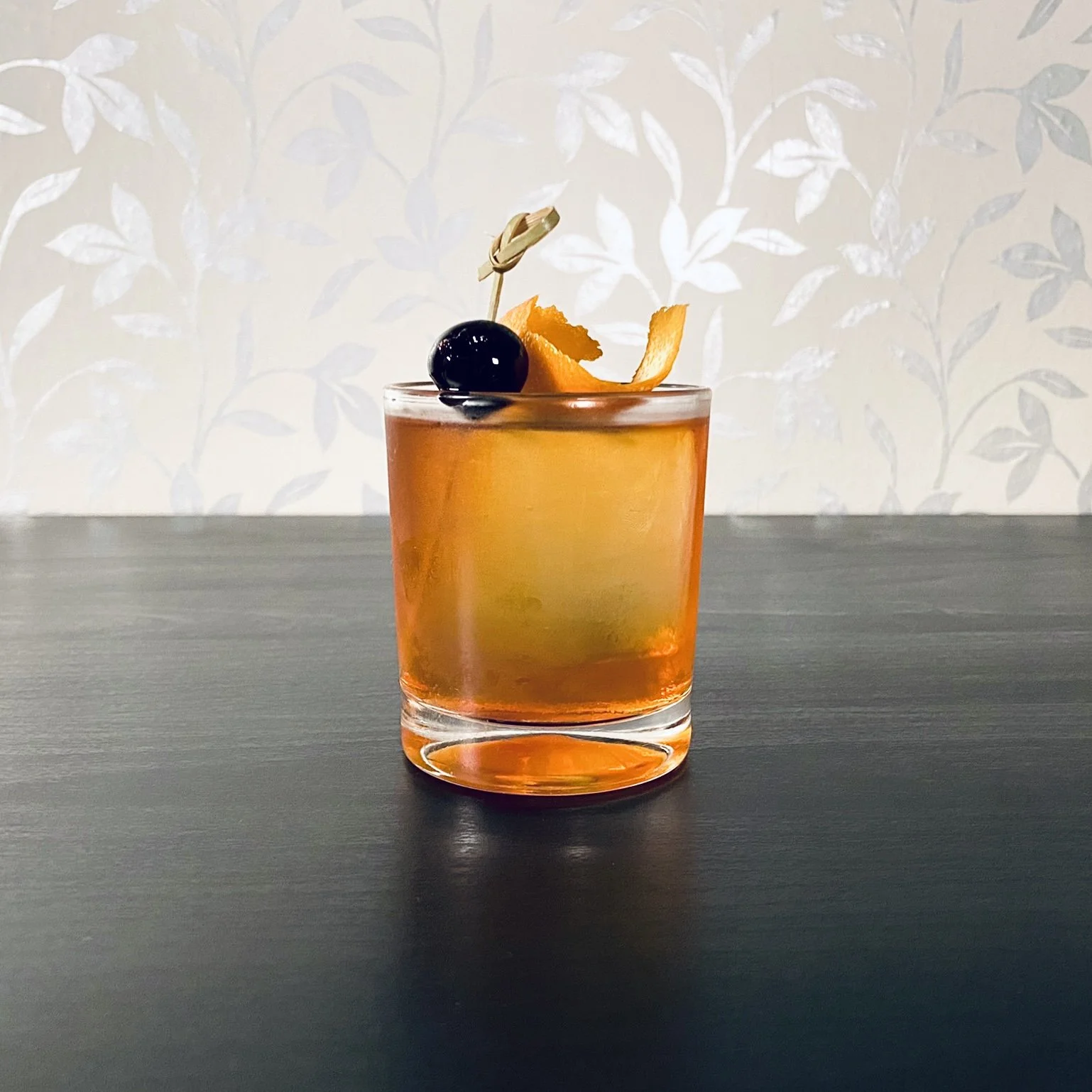 whiskey, simple syrup, and angostura bitters garnished with an orange peel and a maraschino cherry.